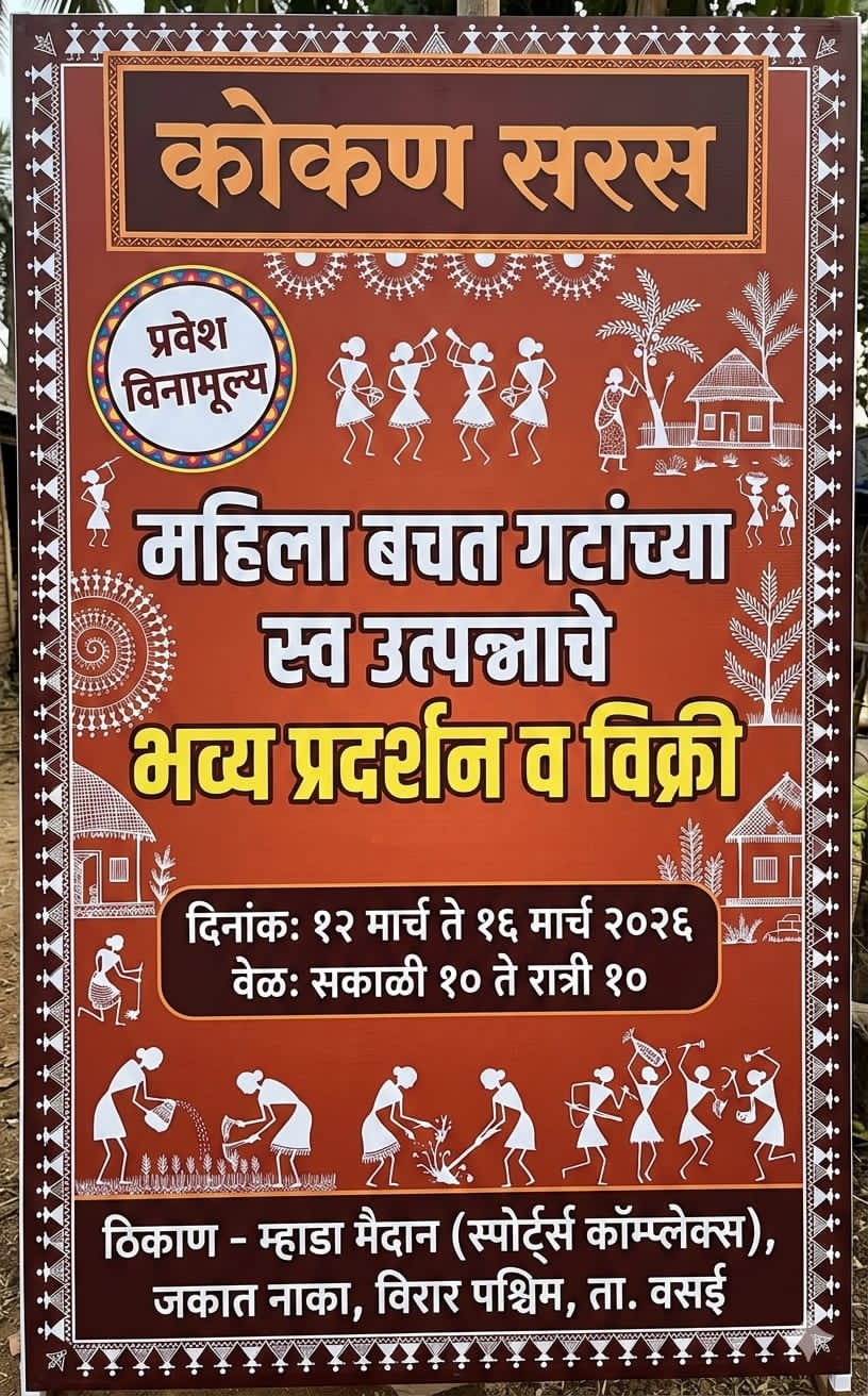 वसई-विरार। ग्रामीण महिलाओं की मेहनत, हुनर और आत्मनिर्भरता को मंच देने के उद्देश्य से “कोकण सरस 2026” का भव्य आयोजन विरार में किया जा रहा है। महाराष्ट्र राज्य ग्रामीण जीवनोन्नति अभियान (उमेद), जिला परिषद पालघर और वसई-विरार महानगरपालिका के संयुक्त तत्वावधान में यह भव्य विक्री व प्रदर्शन मेला 12 से 16 मार्च 2026 तक आयोजित होगा।
