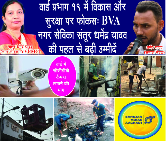 वसई-विरार : वसई विरार शहर महानगरपालिका में कुल 115 नगरसेवक हैं, जिनमें बहुजन विकास आघाड़ी के पास 71 नगरसेवक हैं, जबकि महायुति (भाजपा + शिवसेना) के पास 43 नगरसेवक हैं। इस राजनीतिक समीकरण के बीच वार्ड प्रभाग क्रमांक 19-ब की बहुजन विकास आघाडी की नगर सेविका संतूर धर्मेंद्र यादव अपनी अलग पहचान बनाने में जुटी हुई हैं। नगरसेवक पद संभालने के बाद से उन्होंने क्षेत्र के विकास और नागरिकों की मूलभूत समस्याओं के समाधान को प्राथमिकता देते हुए लगातार सक्रियता दिखाई है।