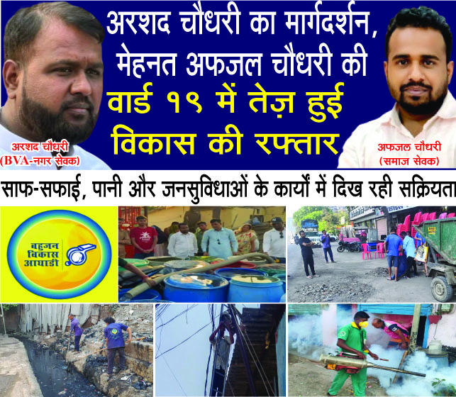 वसई-विरार। वसई-विरार शहर महानगरपालिका क्षेत्र में बहुजन विकास आघाडी के 71 नगर सेवक कार्यरत हैं। इनमें से कई जनप्रतिनिधि अपने क्षेत्रों में सक्रियता से काम कर रहे हैं, जबकि कुछ की सक्रियता अभी भी अपेक्षित स्तर पर नहीं दिखती। ऐसे में जमीनी स्तर पर काम करने वाले नगर सेवकों में वार्ड प्रभाग 19 (ड) के बहुजन विकास आघाडी नगर सेवक अरशद चौधरी का नाम प्रमुखता से सामने आ रहा है।