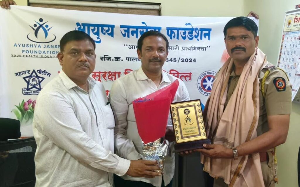 पालघर। जिले के बोईसर शहर व तारापुर एमआईडीसी सहित आसपास के इलाकों में ट्रैफिक व्यवस्था संभालने वाले पुलिस अधिकारियों और जवानों को आयुष्य जनसेवा फाउंडेशन की ओर से सम्मानित किया गया। कार्यक्रम का उद्देश्य सड़क सुरक्षा के लिए दिन-रात डटे कर्मियों का मनोबल बढ़ाना और उनके स्वास्थ्य के प्रति जागरूकता फैलाना रहा।
